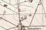 DATOWANIE CMENTARZA LOKALIZACJA NA MAPIE GPS N: 52° 5' 12" E: 16° 51' 30"![]() Cmentarz położony przy polnej drodze z Donatowa do Grabianowa, po jej wschodniej stronie, około 500 m od wsi Donatowo. Kształ cmentarza zbliżony do prostokąta (ok.30x50m), wydłużonego w kierunku północnym. STAN CMENTARZACmentarz to obecnie kępa drzew. Wśród nich są 2 kilkudziesięcioletnie lipy i 6 równie starych kasztanowców. Być może są to drzewa posadzone jeszcze w okresie, gdy cmentarz był użytkowany. Tym bardziej, że kasztanowce są posadzone dość regularnie, wzdłuż podłużnej osi przechodzącej przez środek cmentarza. Poza tym wiele dziko rosnących akacji. Trochę bzów; północna krawędź cmentarza porośnieta krzewami śnieguliczki - prawdopodobnie było to pas krzewów wzdłuż ogrodzenia. Całe poszycie cmentarza to bardzo gęsty dywan bluszczu, spod którego nic nie widać. Trochę śmieci, szczególnie od strony wsi Donatowo; jak zwykle w takich przypadkach bezpański "lasek" stanowi dla wielu miejsce ich bezkarnego pozbywania się. W czasie wizyty na cmentarzu udało się odkryć pozostałości prawdopodobnie jedynego zachowanego grobu. Jest to charakterystyczne betonowe obmurowanie z szerszą powierzchnią w głowach - na ulokowanie płyty nagrobnej (położono tam duży kamień). Usunięto z powierzchni grobu bluszcz, aby przypominał przypadkowym spacerowiczom o pierwotnej funkcji tego miejsca. ZDJĘCIA