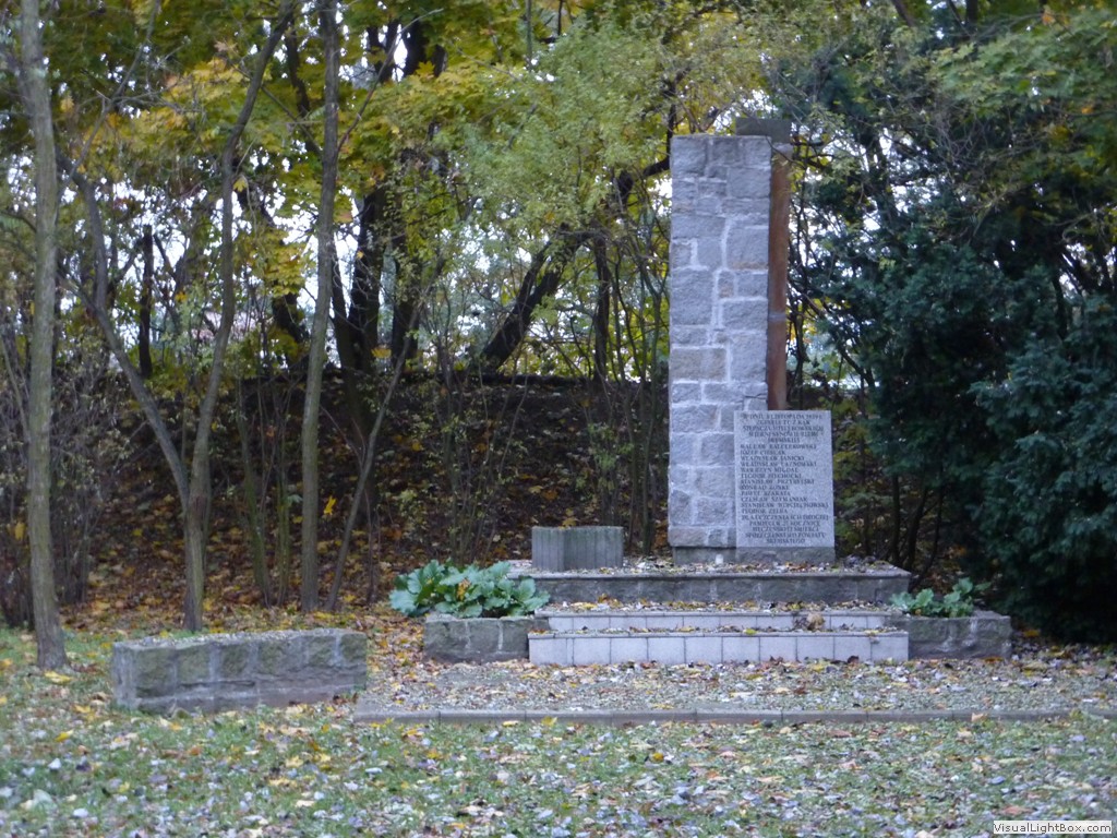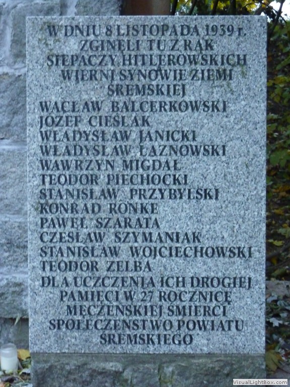 Materiał pochodzi ze strony: dws.org.pl / Twoje forum o wojnach światowych / Trzy dni terroru Śrem - wrzesień 1939 roku. Niemcy już od 8 września (pierwszego dnia od wkroczenia) brali zakładników pośród co zacnejszych Śremian. Po kilku dniach część ich zwolniono, zabrano innych zakładników. Nadszedł 19 października i aresztowano dodatkowych zakładników (łącznie zakładnikami było ok. 30 osób). Wieczorem 19-tego na śremski rynek zwieziono belki, kamienie, żwir budując z nich kulochwyt. Tego też dnia wydano zarządzanie nakazujące się stawić się 20 października o 9:00 na śremskim rynku wszystkim mężczyznom w wieku od 16 do 60 lat. Coś niepokojącego wisiało w powietrzu. Rankiem przyjechał autobusem oddział egzekucyjny i gdy odbywał ćwiczenia na podwórzu ratusza, w tym samym czasie w ratuszu odbywała się "rozprawa". Aresztowanych wprowadzono w grupach po 5 przed 3 sędziów, na sali był jeszcze tłumacz i protokolant. Rozprawa odbywała się bez żadnych zarzutów - pytano o personalia, przynależność partyjną, działalność społeczną. Po dwóch godzinach rozprawa się skończyła, aresztantów wyprowadzono na dziedziniec i podzielono na 3 grupy. Dwie pierwsze wezwano ponownie na salę i odczytano wyrok "śmierć przez rozstrzelanie". Następnie pierwszą dziesiątkę wyprowadzono na rynek i ustawiono pod ścianą. Jeden ze skazanych Marian Ernst zdążył krzyknąć "Niech żyje Polska", ksiądz Antoni Rzadki ukląkł, przez co ominęły go pociski. Ci, którzy dawali znaki życia zostali dobici przez żandarmów. Po usunięciu ciał rozstrzelano pozostałą 9-tkę. 8 listopada 1939 miała miejsce kolejna egzekucja. Na terenie Starej Strzelnicy w pobliżu Zbrudzewa stracono 12 osób oskarżonych o znęcanie się nad internowanymi Niemcami. Wacław Balcerowicz - kowal Józef Cieślak - robotnik Władysław Janicki - kupiec Władysław Łaznowski - robotnik Wawrzyn Migdał - robotnik Teodor Piechocki - krawiec Paweł Przybylski - robotnik Konrad Ronke - kupiec Paweł Szarata - robotnik Czesław Szymaniak - robotnik Stanisław Wojciechowski - szklarz Teodor Zelba - robotnik W czasie wojny krążyła plotka jakoby w drodze na miejsce kaźni zdołał uciec i uratować się Konrad Ronke. Po wojnie z inicjatywy wiceburmistrza Marcelego Szczęsnego przeprowadzono ekshumacje zwłok - odkopano całą 12. Uroczysty pogrzeb ofiar egzekucji odbył się 25 kwietnia 1945. Ofiary obu śremskich egzekucji spoczywają we wspólnym grobie na cmentarzu przy kościele farnym. ZDJĘCIA